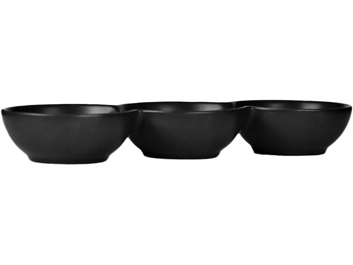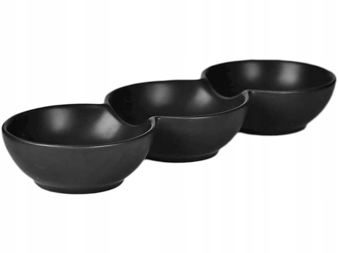 Zestaw trzech połączonych, okrągłych miseczek, wykonanych z czarnej porcelany.