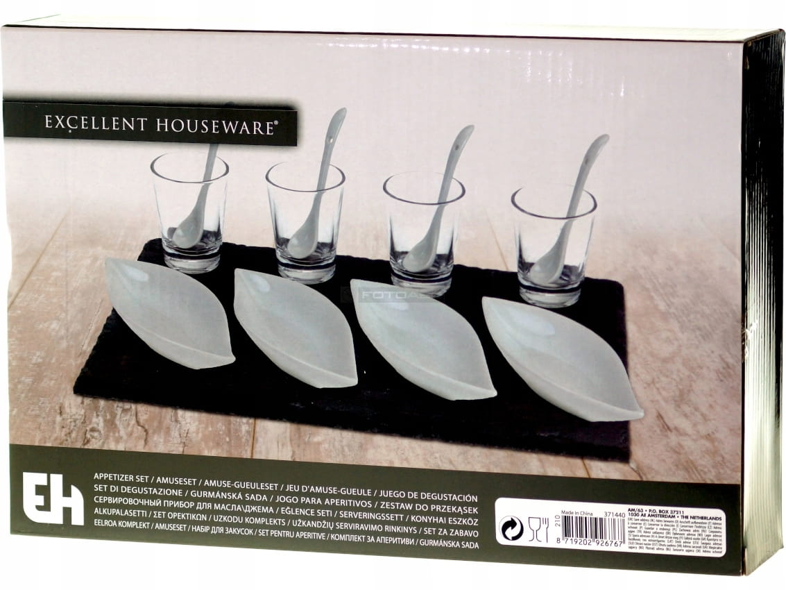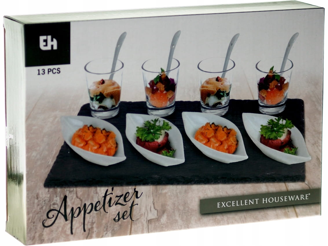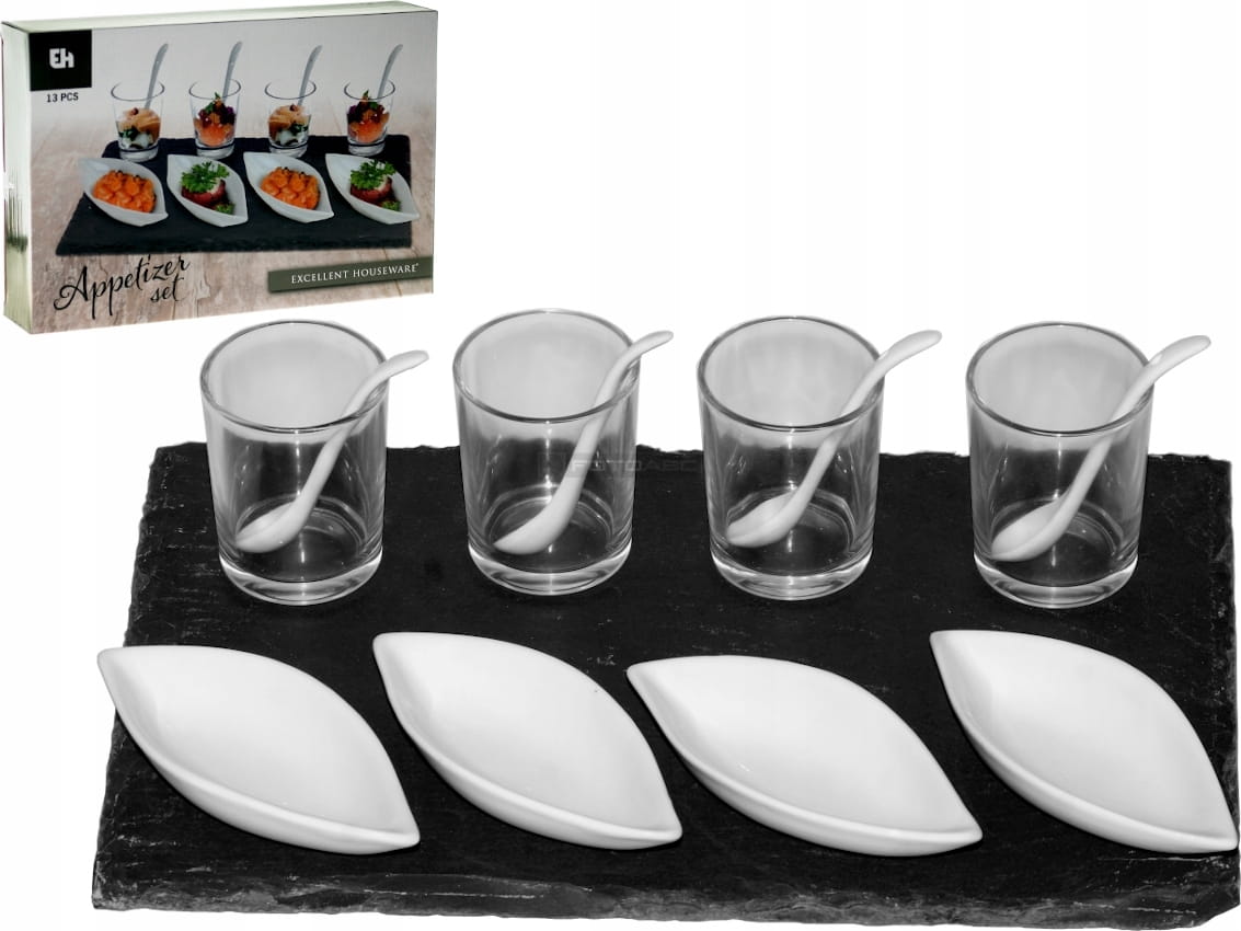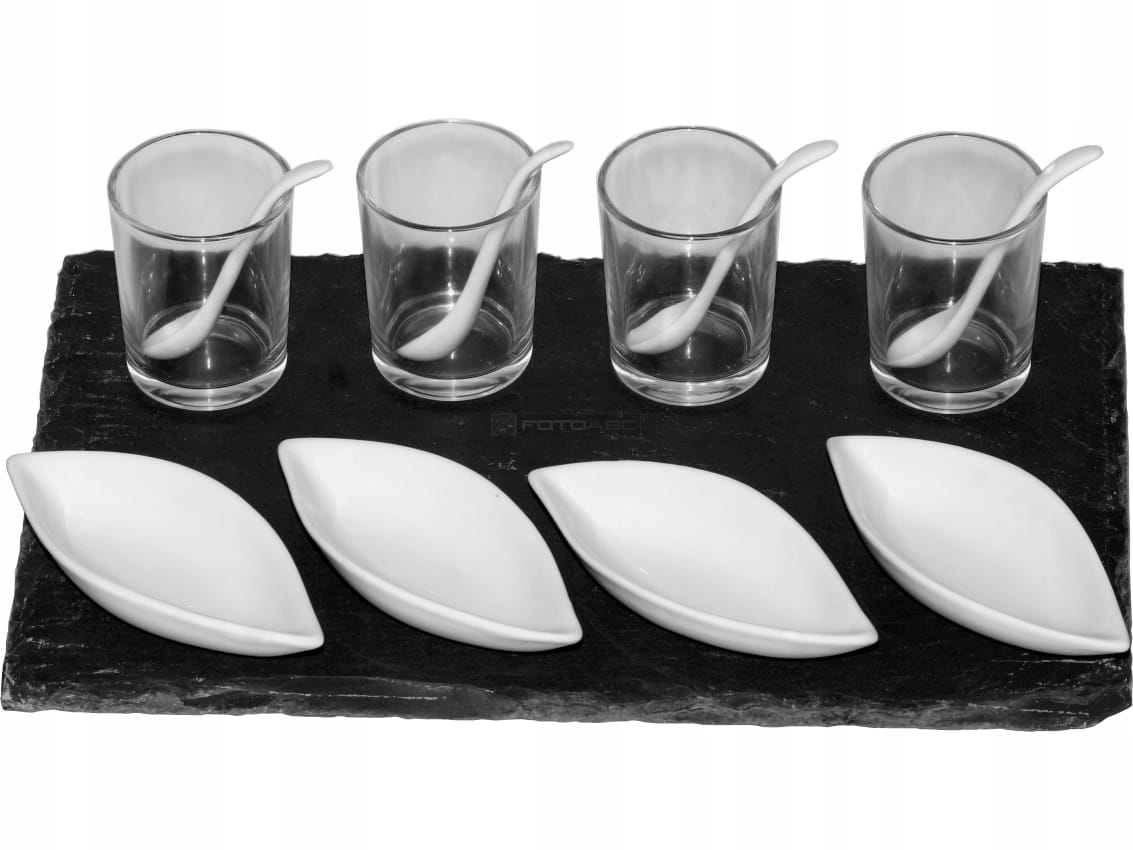 W zestawie płyta z kamiennego łupka + szklaneczki, miseczki i łyżeczki.
