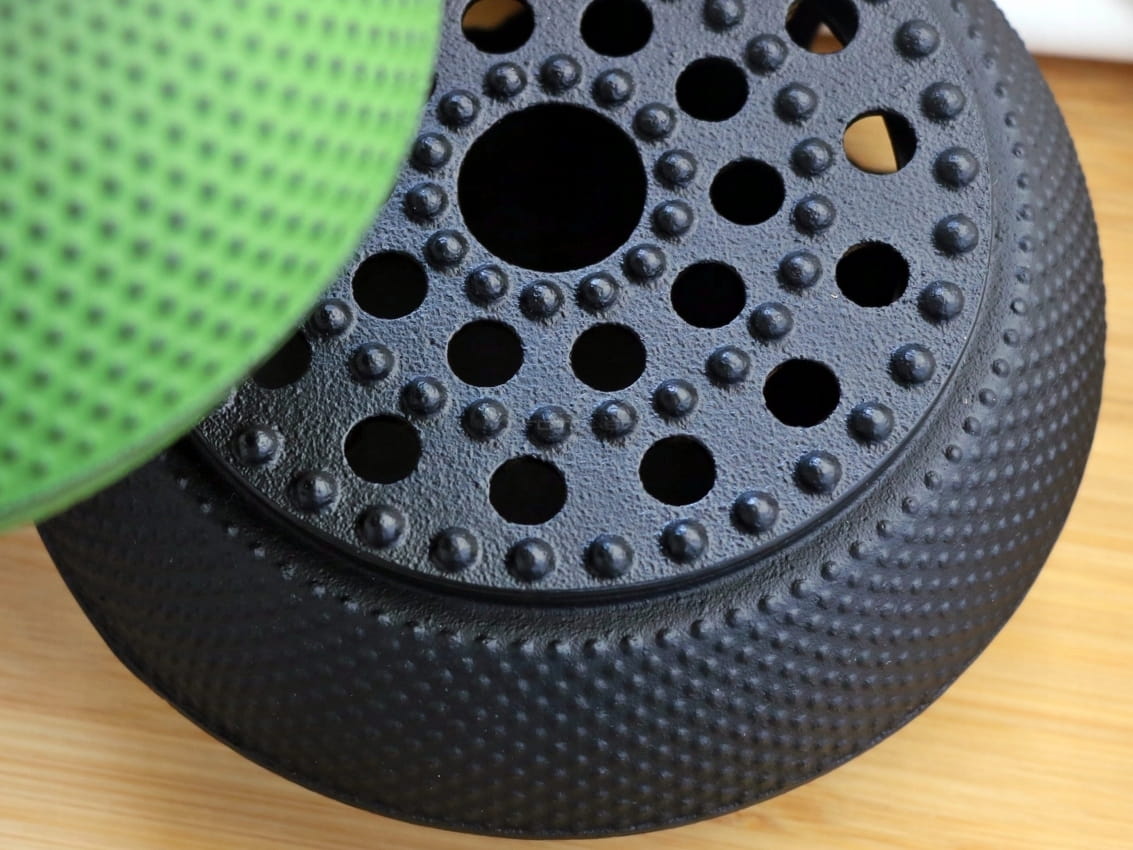 W dolnej części korpus posiada 6 otworów zapewniających cyrkulację powietrza, natomiast pokrywka - aby lepiej oddawać ciepło - wygląda jak sito z 25 dziurkami, oraz umiejscowionymi między nimi wypukłościami, które delikatnie unoszą postawiony na podgrzewaczu czajnik.