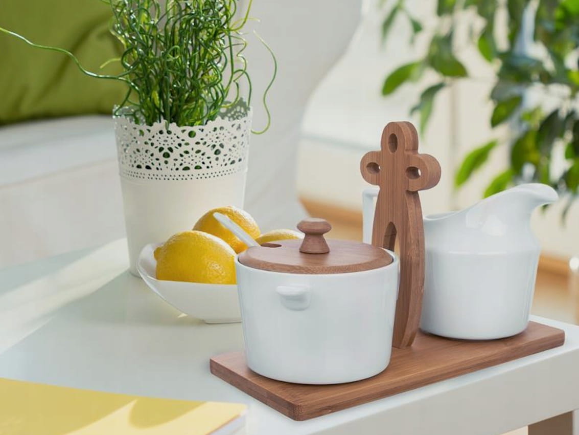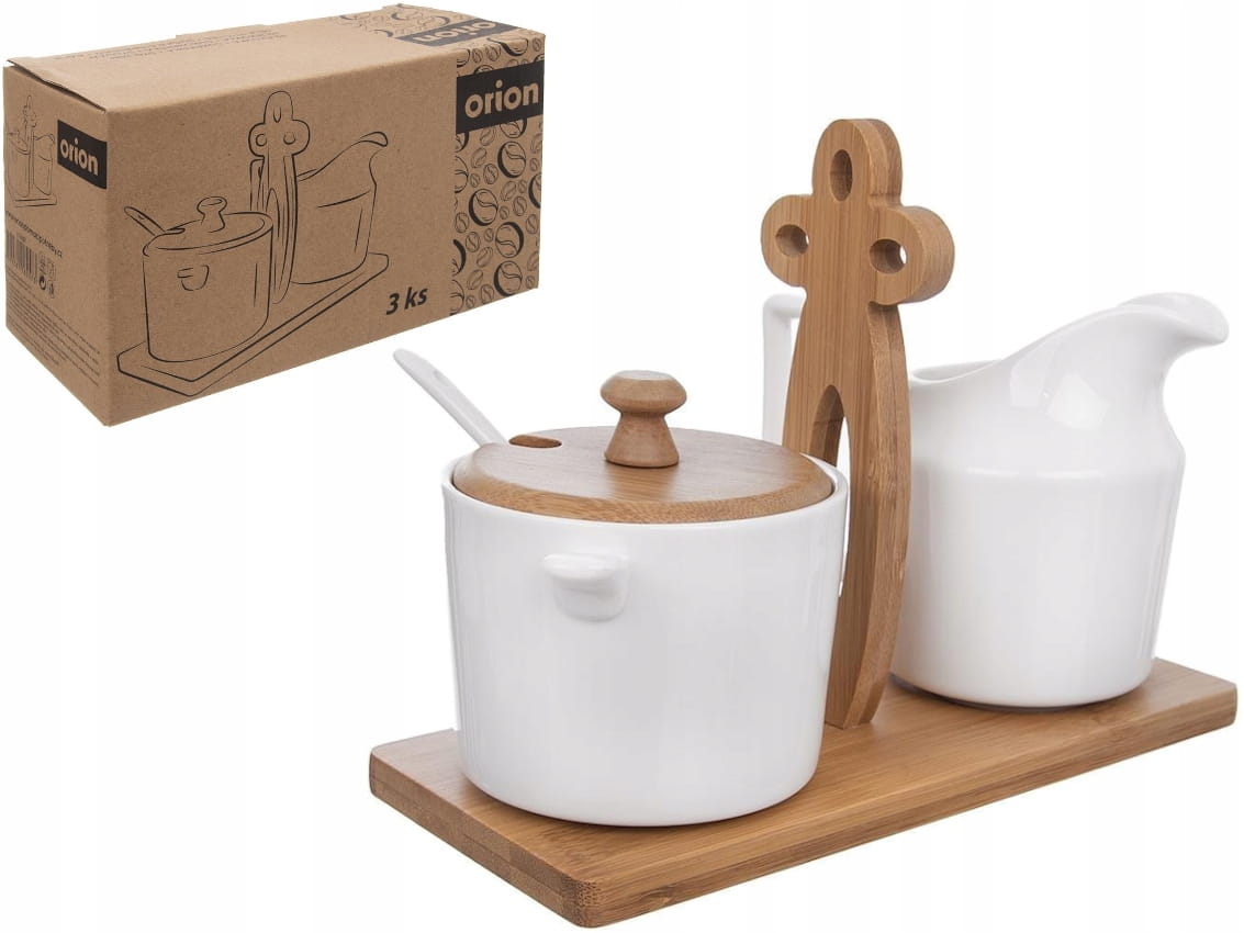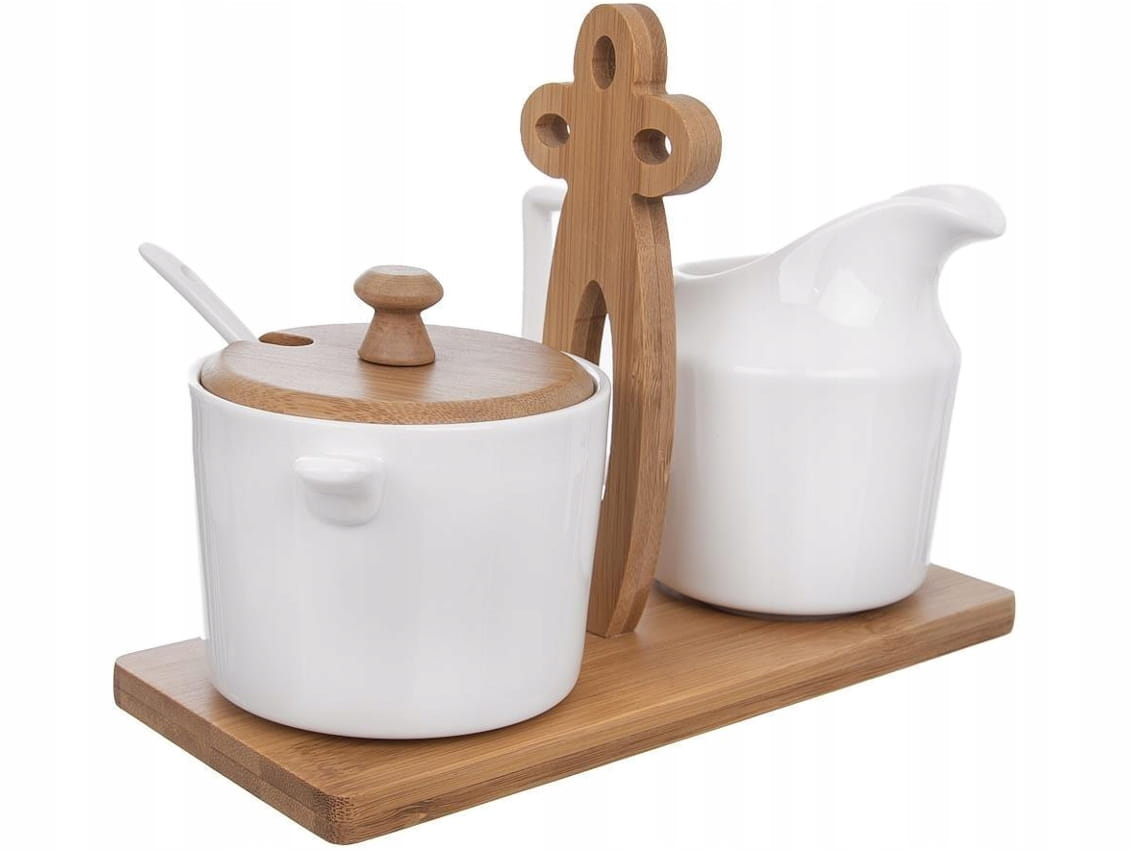 Praktyczny komplet do cukru i mleka na drewnianym stojaku.