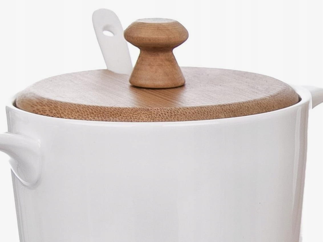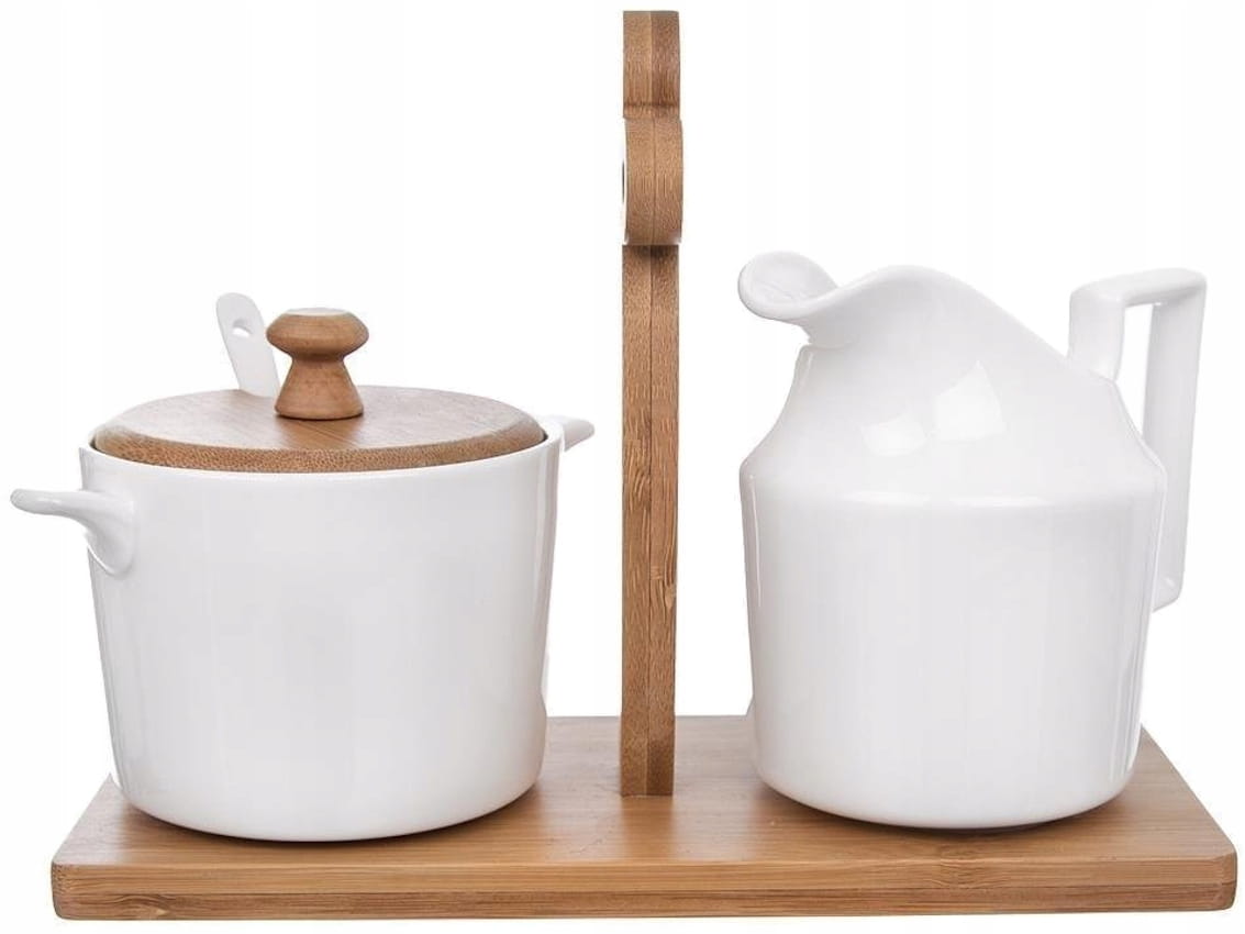 Porcelanowe cukiernica oraz mlecznik na podstawce z drewna bambusowego.
