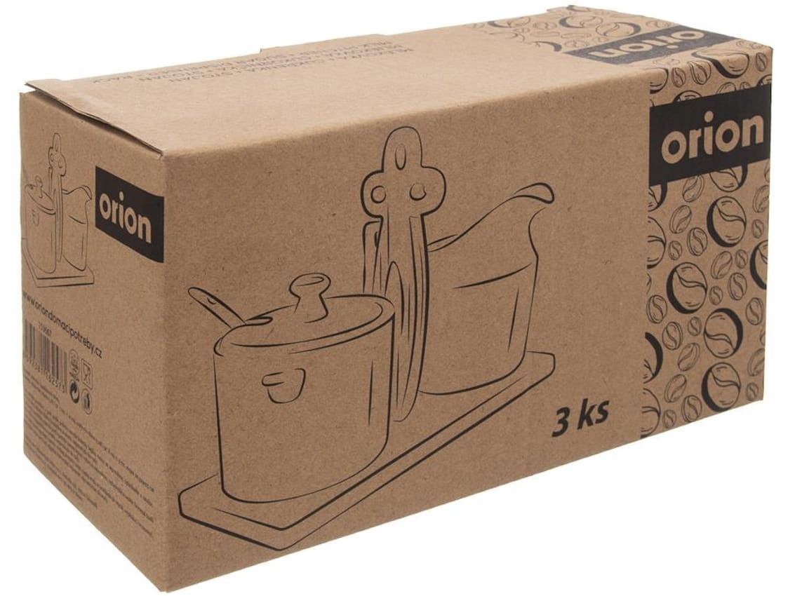 Zestaw zawiera cukierniczkę z pokrywką i łyżeczką, mlecznik oraz stojak.