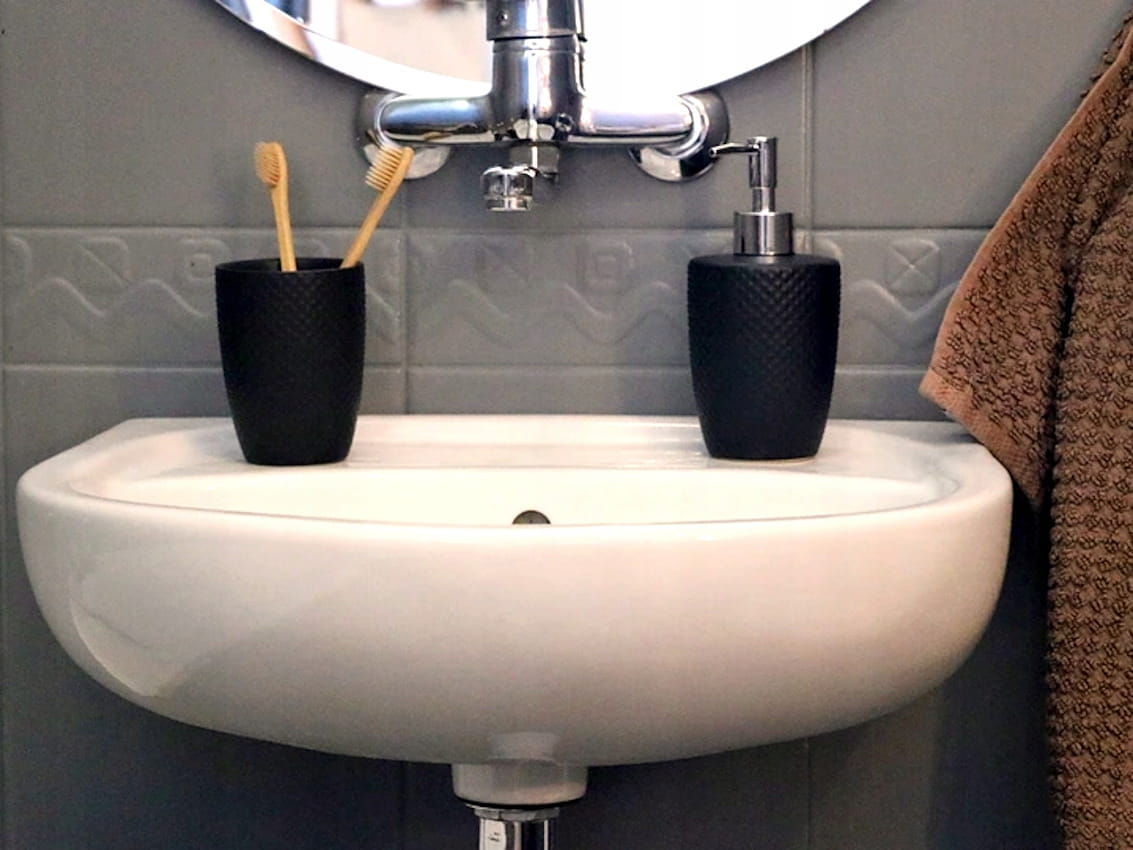 - Dwuczęściowy zestaw składa się z: dozownika na mydło w płynie lub balsam oraz kubka na przybory