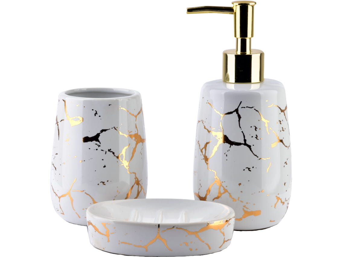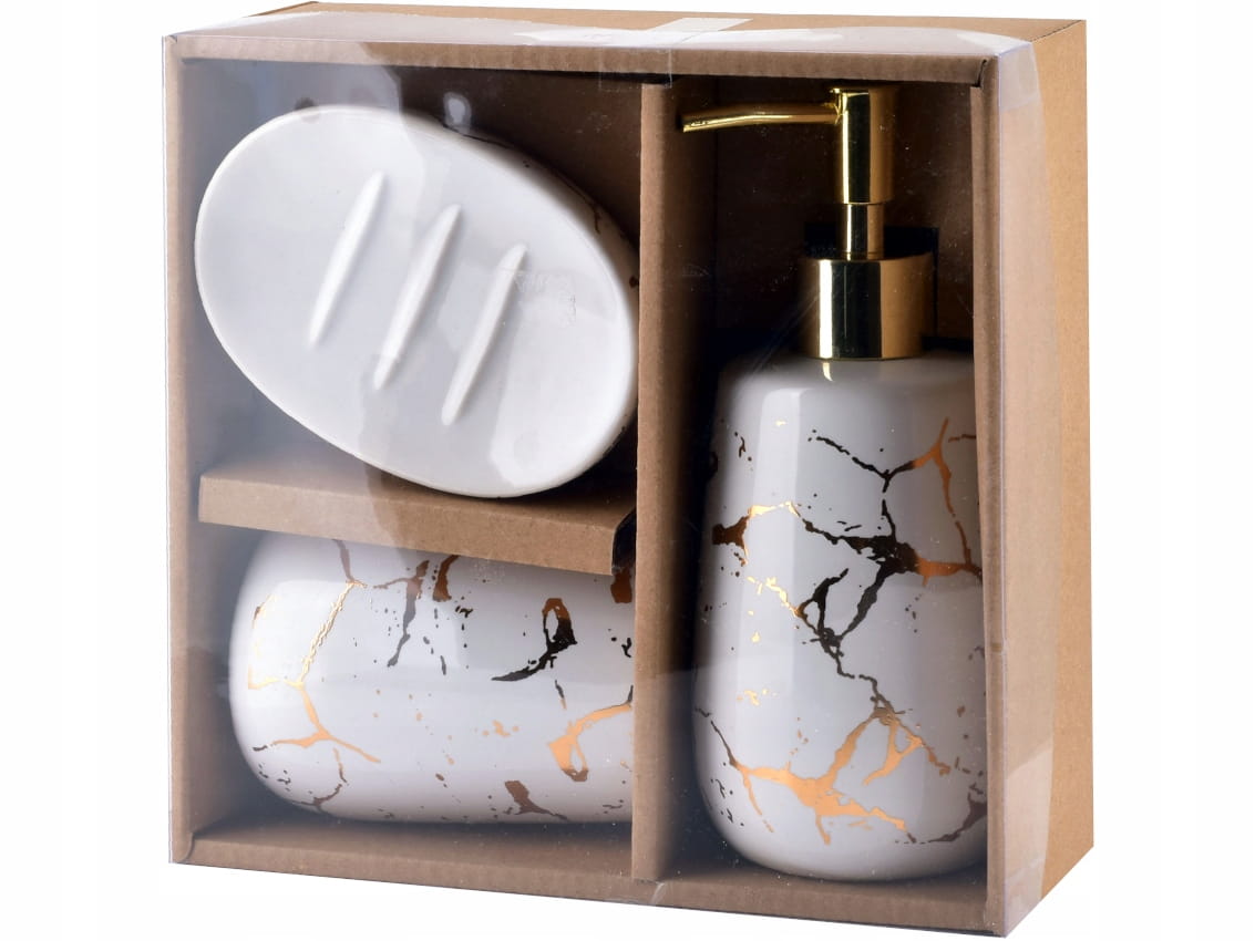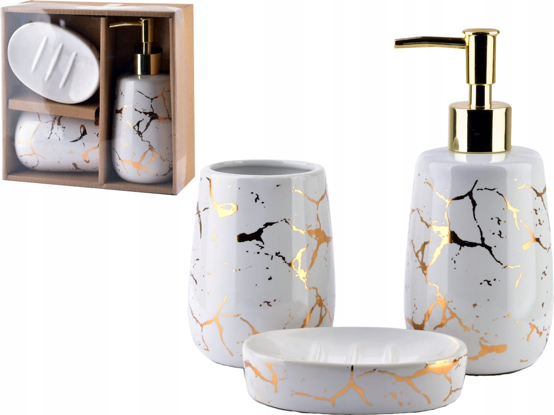 - Trzyczęściowy zestaw składa się z: dozownika na mydło w płynie lub balsam, mydelniczki oraz kubka na przybory