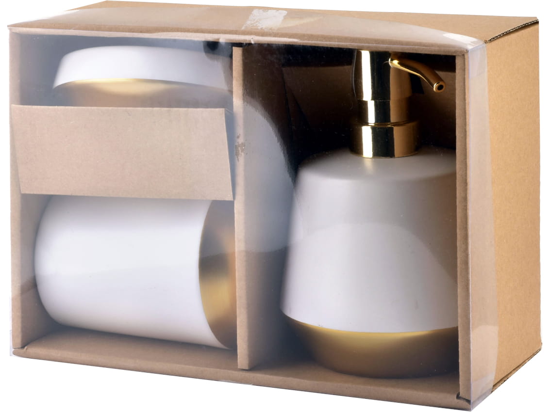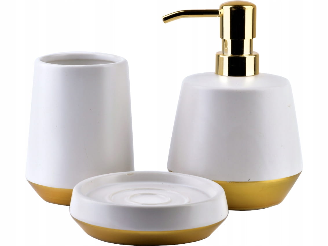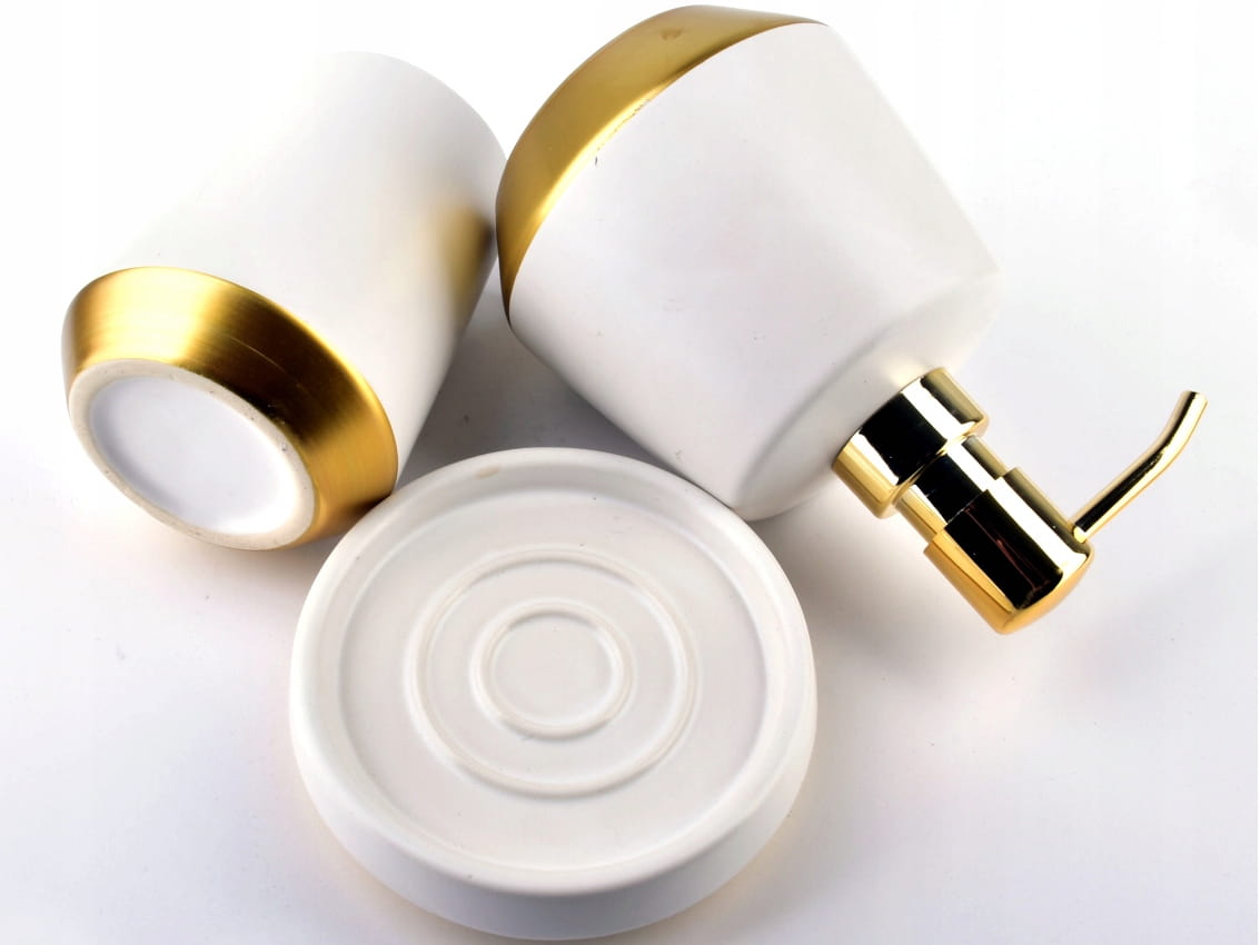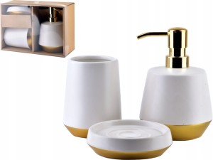 - Trzyczęściowy zestaw składa się z: dozownika na mydło w płynie lub balsam, mydelniczki oraz kubka na przybory